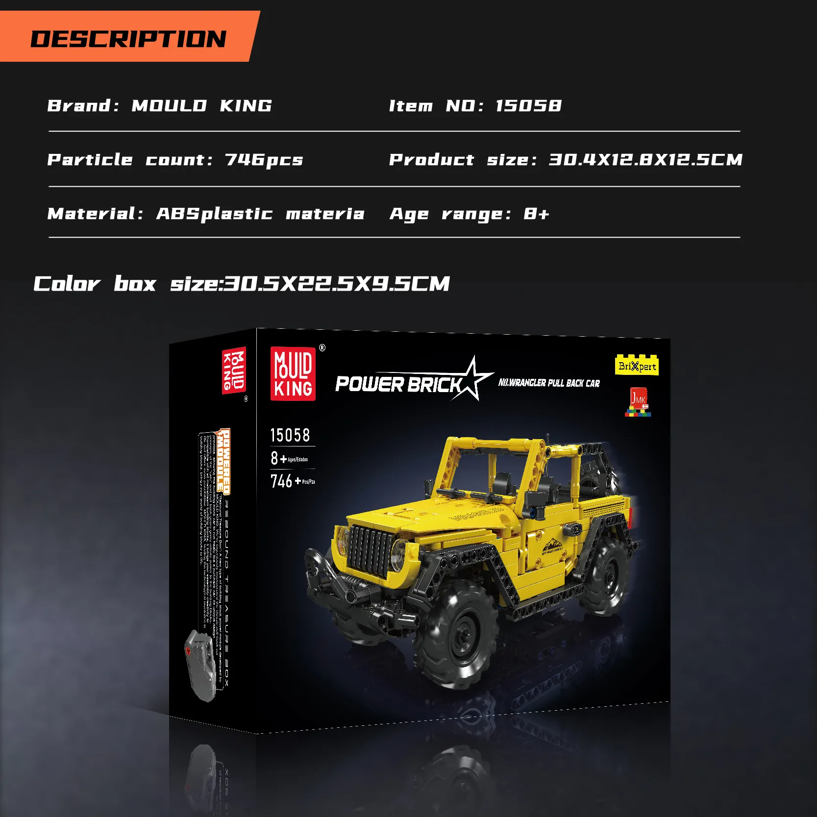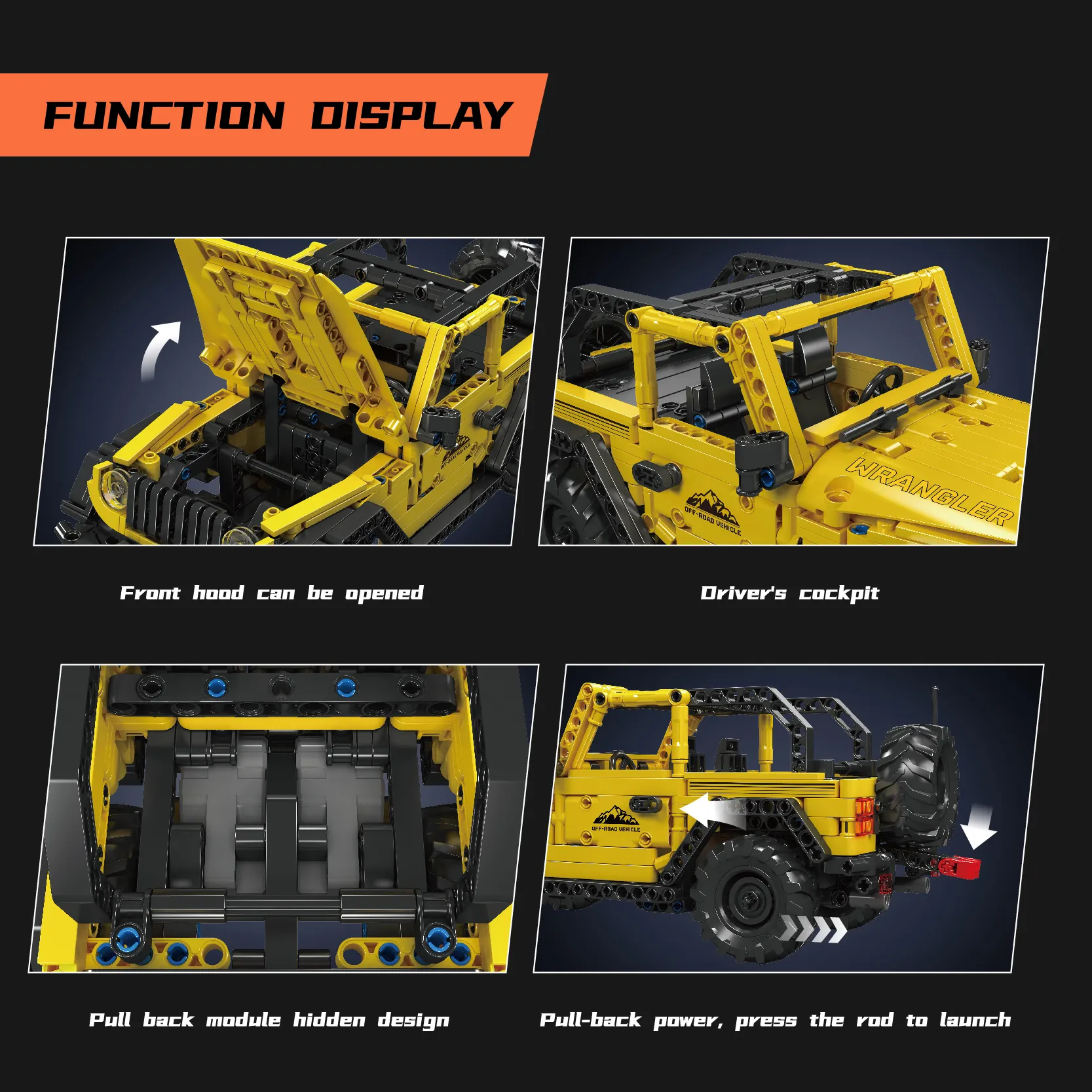15058 de Mould King Ensamble un vehículo todoterreno Wranger a escala 1:16, completo con capó que se abre, puertas que se abren, un compartimiento del motor detallado y funcionalidad de retroceso.